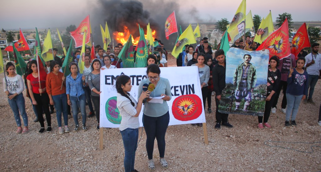 Dozens of young men gathered in in Al-Ahris district in Al-Shahba canton, set fires, raised the flags of the Revolutionary Youth Movement and the Young Women’s Movement and pictures of the leader Abdullah Ocalan. They read a statement the text of it read: