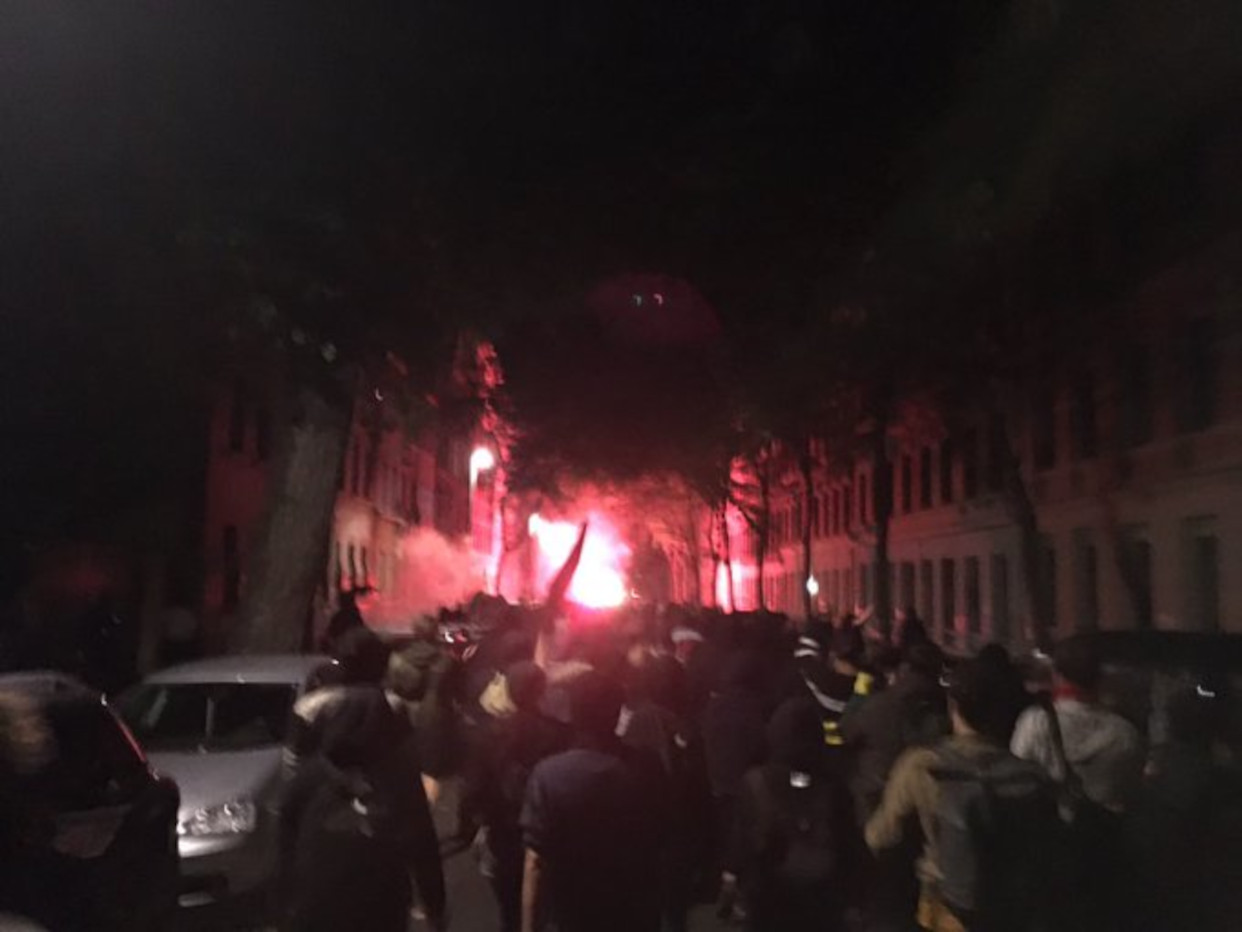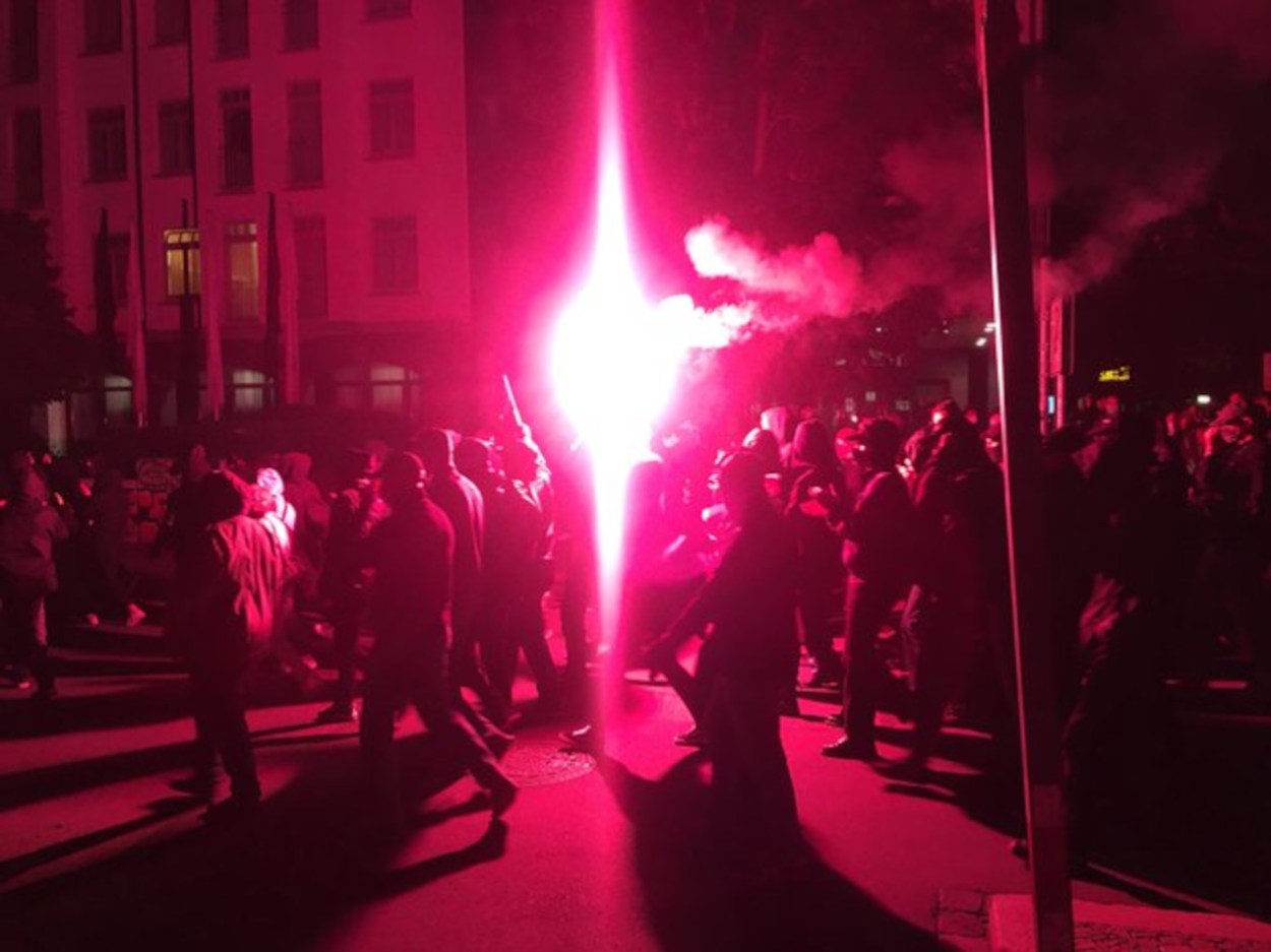 What followed was an appropriate reaction to the inhuman practice of the cops. After the spontaneous demo had set itself in motion with extensive use of pyrotechnics, first a cop station was attacked, surveillance cameras destroyed and some windows damaged by means of paint bombs and stones. This was the fifth major attack on this cop station since it opened in 2014.