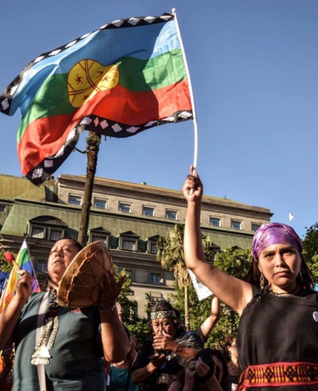 During the demonstrations, the Wenufoye or Mapuche flag was carried as a sign of sympathy for the demands of our people la Wenufoye o bandera Mapuche The response from the government of Sebastián Piñera was the application of the state of emergency, a curfew and a strong repression that left many people injured and tortured, women are victims of abuses and many young people lost their eyes by the rubber’ bullets of the carabinieri.