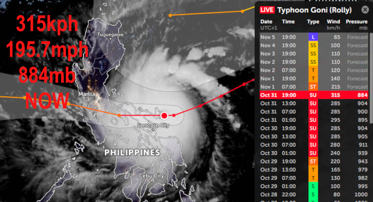 The Philippines is bracing for the world’s most powerful tropical cyclone yet in 2020. The super typhoon now coming ashore has winds up to 315kph and gusts up to 350kph, over 200mph