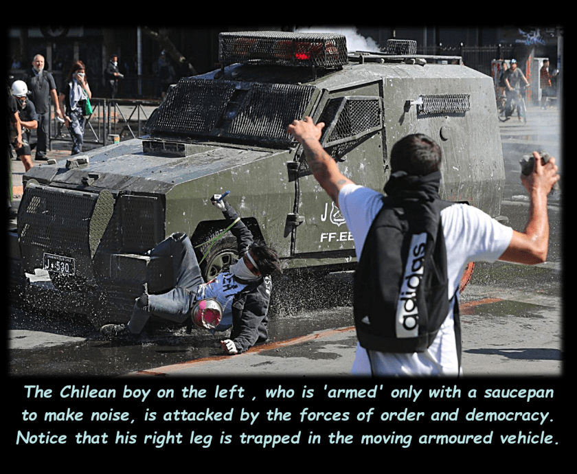 Qualquer um que caia nas garras dos carabineiros, ou que tenha a má sorte de estar compartilhando a rua ou espaço com estes psicopatas de uniforme, pode morrer, perder seus olhos ou ficar com severos danos cerebrais ou a nível orgânico do corpo, isto é inaceitável, e estão muito equivocados se creem que cruzaremos nossos braços e guardaremos silêncio.