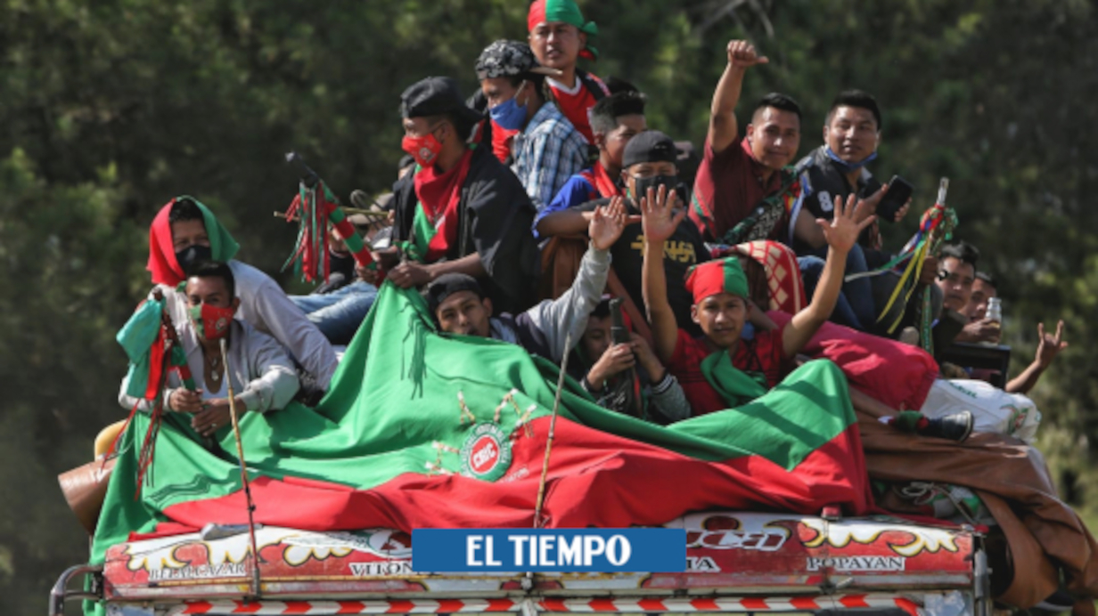 “Guard, guard. Strength, strength ”, thousands of young people chant raising their chontas (wooden canes), showing the decision of the native peoples, blacks and peasants to defend life and territory, during the Minga that has arrived on Sunday, October 18 for the night to Bogotá. There are 8,000 wills who traveled 450 kilometers from Cali, in the south of the country, to the capital, mobilizing 500 vehicles, many goats (open buses from rural regions) and walking in an orderly manner, flanked by the Indigenous Guard.
