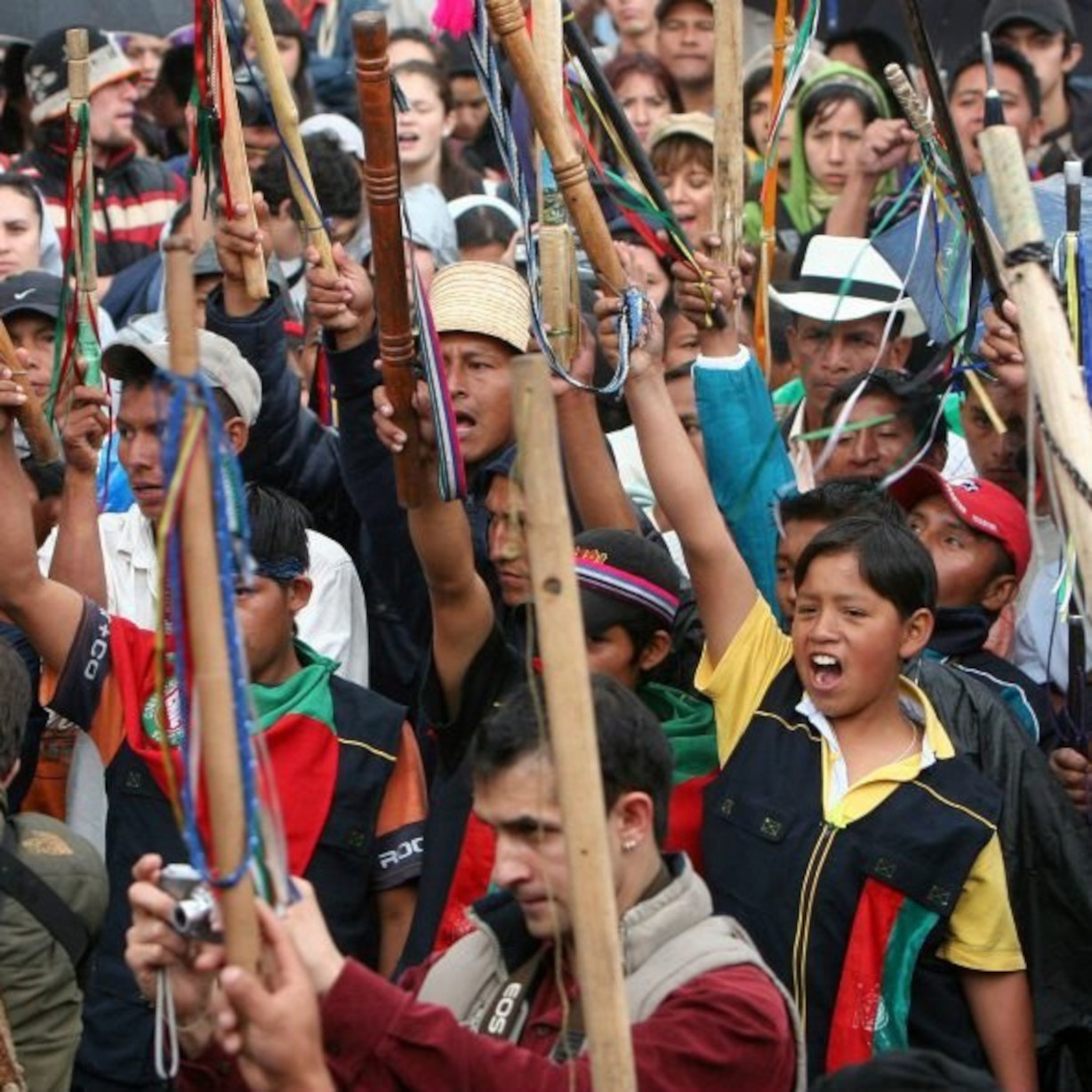 “Guardia, guardia. Fuerza, fuerza”, corean miles de jóvenes levantando sus chontas (bastones de madera), mostrando la decisión de los pueblos originarios, negros y campesinos de defender la vida y el territorio, durante la Minga que ha llegado el domingo 18 de octubre por la noche a Bogotá. Son 8.000 voluntades que recorrieron 450 kilómetros desde Cali, en el sur del país, hasta la capital, movilizando 500 vehículos, muchísimas chivas (autobuses abiertos de las regiones rurales) y caminando en forma ordenada, flanqueados por la Guardia Indígena.