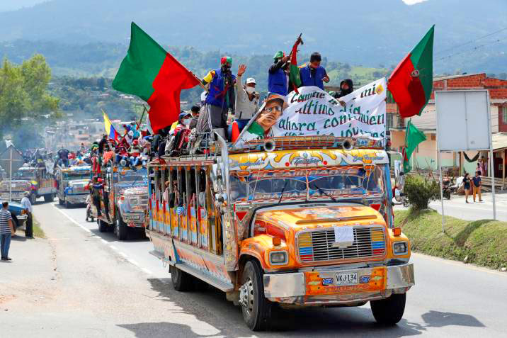 Lo cierto es que la llegada de miles de indígenas, afros y campesinos a Bogotá movilizó a buena parte de la capital, donde fue recibida por los jóvenes que ganaron las calles en noviembre pasado, durante el paro nacional, y las ocuparon nuevamente el 9 y 10 de setiembre en respuesta al asesinato de un abogado por la policía. Las chivas multicolores circulaban rebosantes al son de pitos y tambores.
