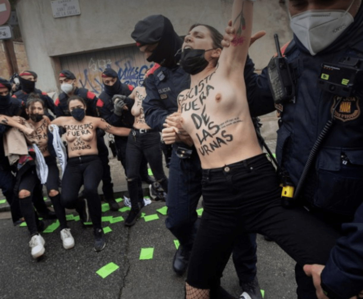 El grupo feminista Femen se ha presentado en el colegio electoral de la calle Sant Joan de la Salle, 42 de Barcelona, para protestar delante del candidato de Vox, Ignacio Garriga, antes de ir a votar. Las feministas han lanzado papeles de color verde donde pedían «Fascistas fuera de las urnas» y reiteraban que «Femen va contra el fascismo institucional». Las mujeres han sido retenidas por los Mossos y han quedado aisladas al otro lado de la calle.