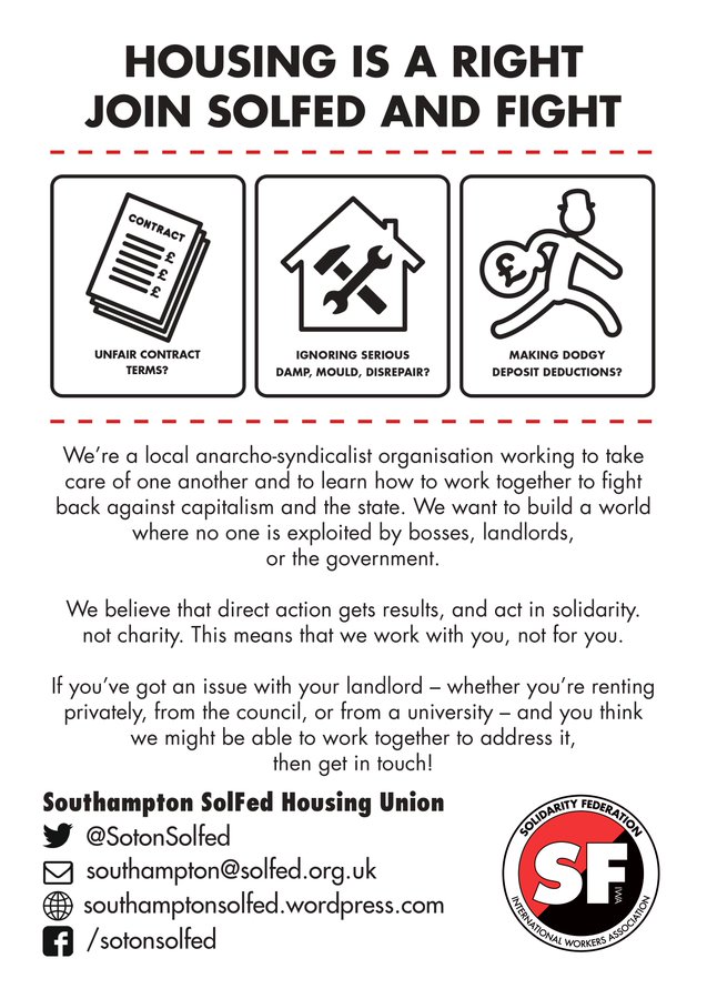 Enter a group of old-school anarcho-syndicalist activists, who are helping vulnerable students take on their dodgy landlords. Formed in March 1994, Solidarity Federation (more commonly known as SolFed) is a collection of groups across the UK and Ireland helping to fight for workers and tenants’ rights. Anarcho-syndicalism is a political philosophy that believes revolutionary industrial unionism is needed for workers to regain control of the economy and broader society. As a school of thought, it highlights the importance of direct democracy and solidarity.