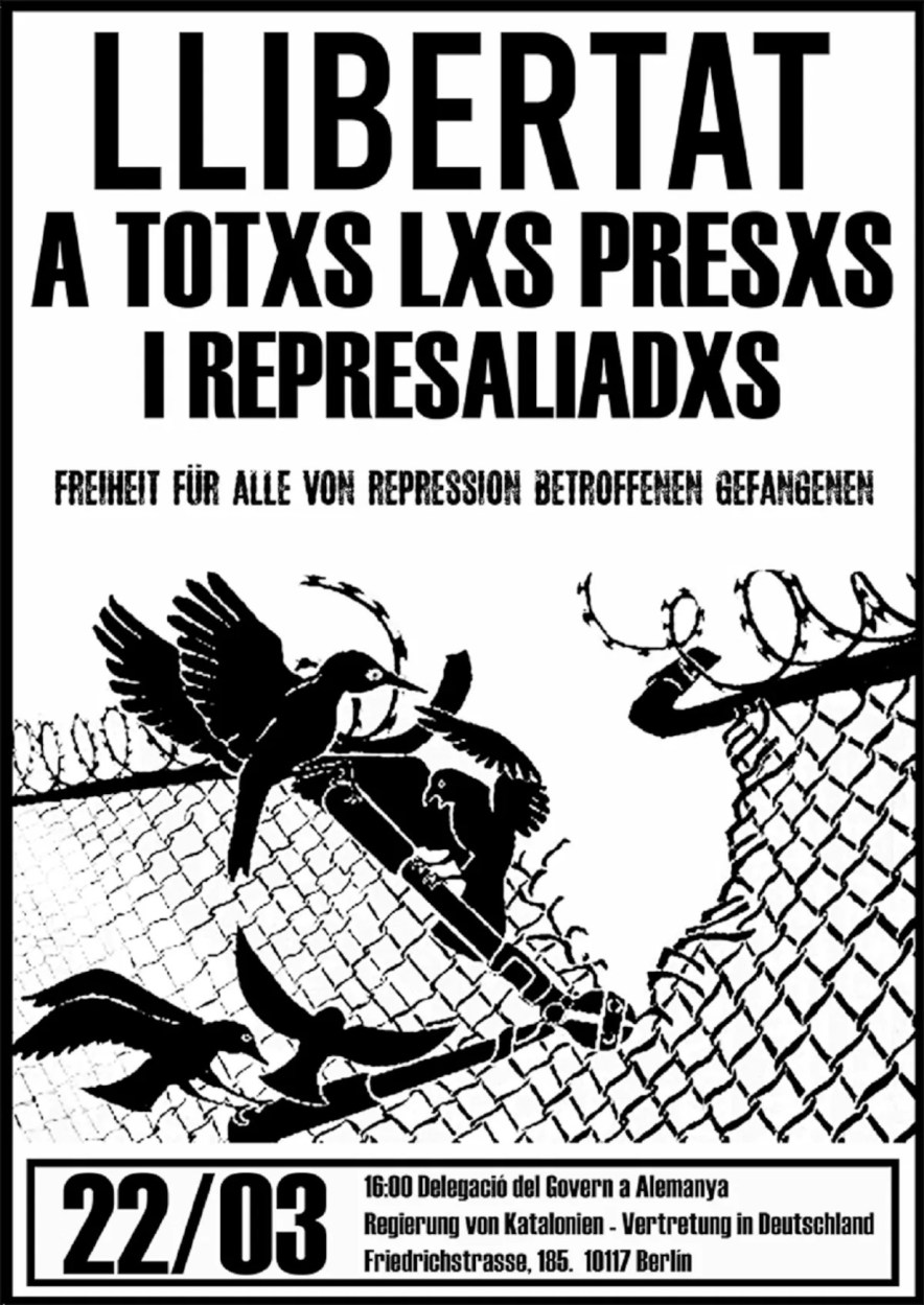 4 thoughts on “Berlín: Mani 22/3.. Libertad para todos los presos afectados por la represión en Barcelona.. Esp/Eng/De”