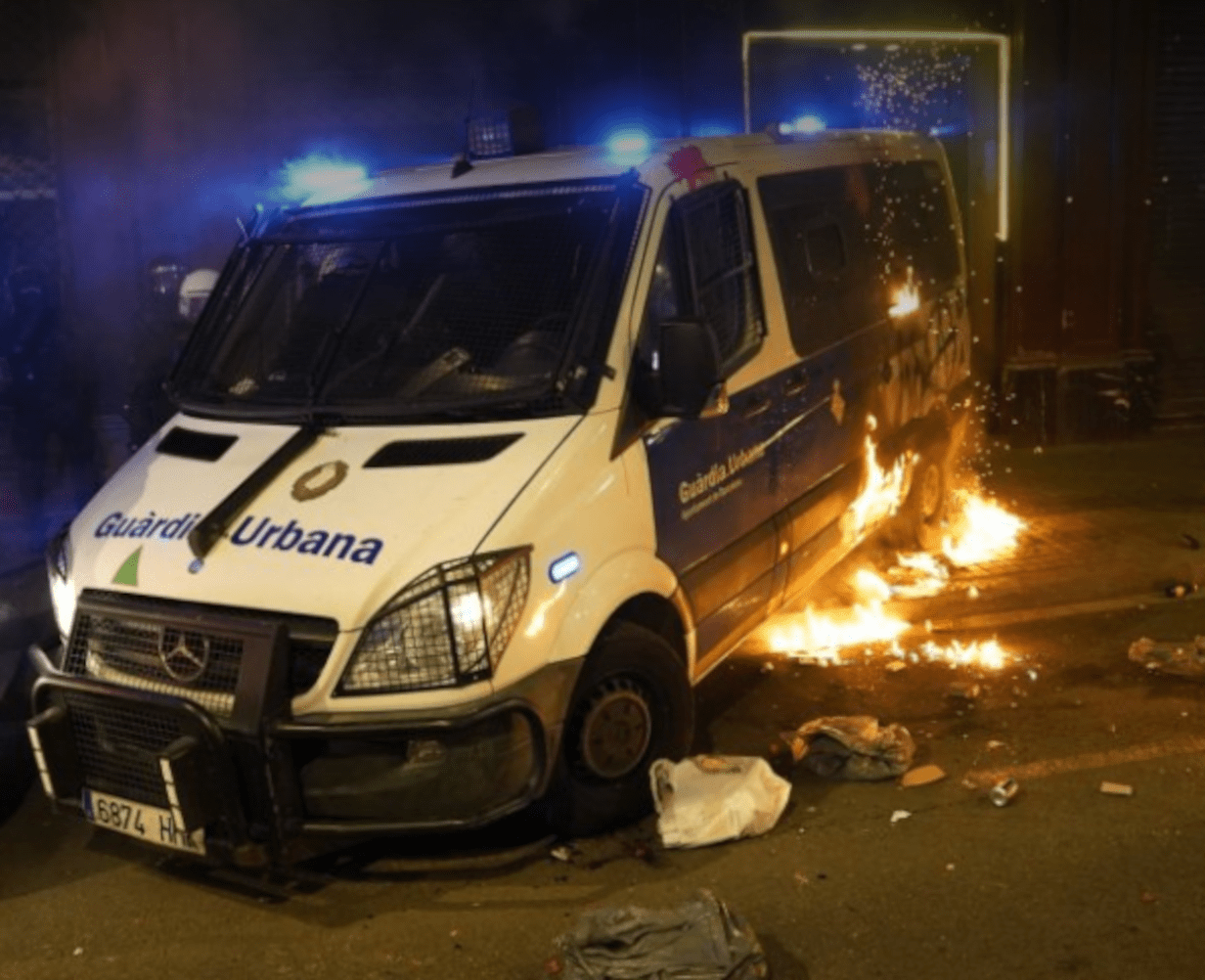Todo ello a consecuencia del incendio de una de las furgonetas de la policía antidisturbios de la Guardia Urbana de Barcelona, organización policial que cuenta con un largo historial de tortura y violencia.