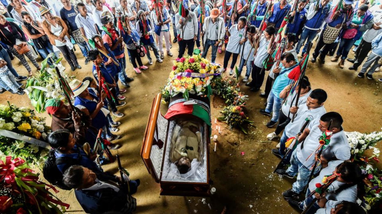 Funeral of slain guerrilla fighter, Edwin Dagua, an indigenous leader on the Huellas reserve, one of many victims of Colombia’s long civil war. One human rights activist or social leader was murdered every two days in Colombia last year, [Source: trtworld.com]