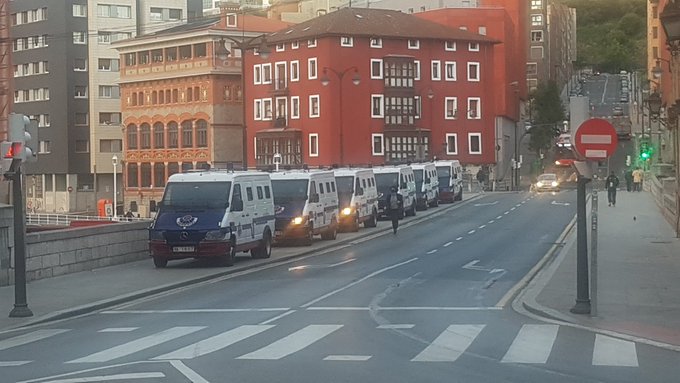 Desde primera hora de la mañana, furgonetas de la Ertzaintza aguardan en varias de las entradas del Casco Viejo, que es peatonal. Concretamente, en el puente de San Antón, en la trasera del Teatro Arriaga y en la calle La Cruz.