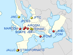 Allied Command Transformation (ACT; yellow marks) and Allied Command Operations (ACO; red marks)—the latter of which has Supreme Headquarters Allied Powers Europe (SHAPE) as its headquarters. The subordinate centres of ACT and subordinate commands and joint force commands of ACO are also shown.- v t e – Wikipedia