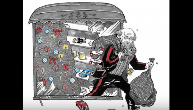 According to Ruth Kinna, Kropotkin contemplated dressing up as Santa Claus in order to expropriate toys from shops and give them away to children for free. Kropotkin wrote on the edge of one page, “[i]nfiltrate the stores, give away the toys!”. On the back of a postcard he wrote,
