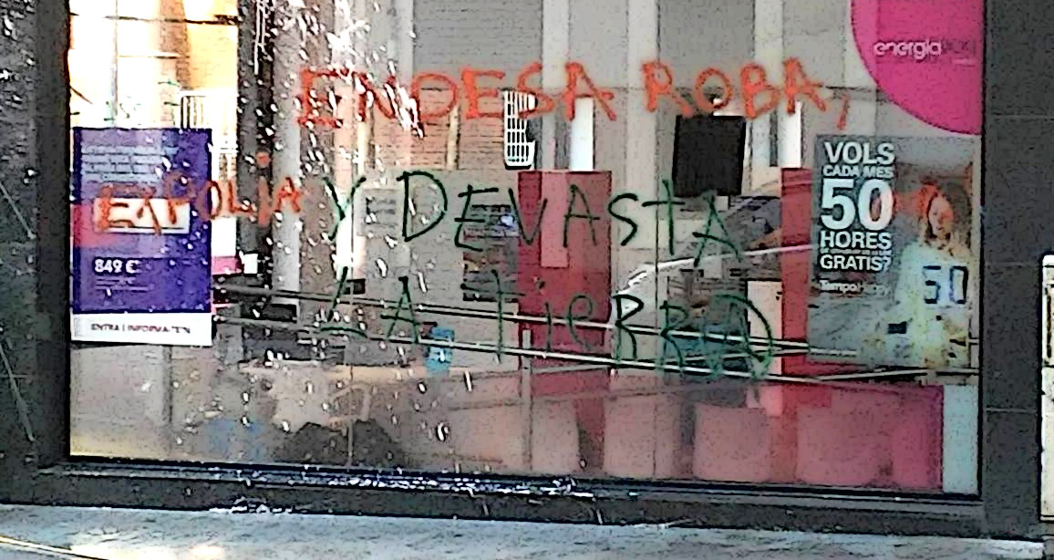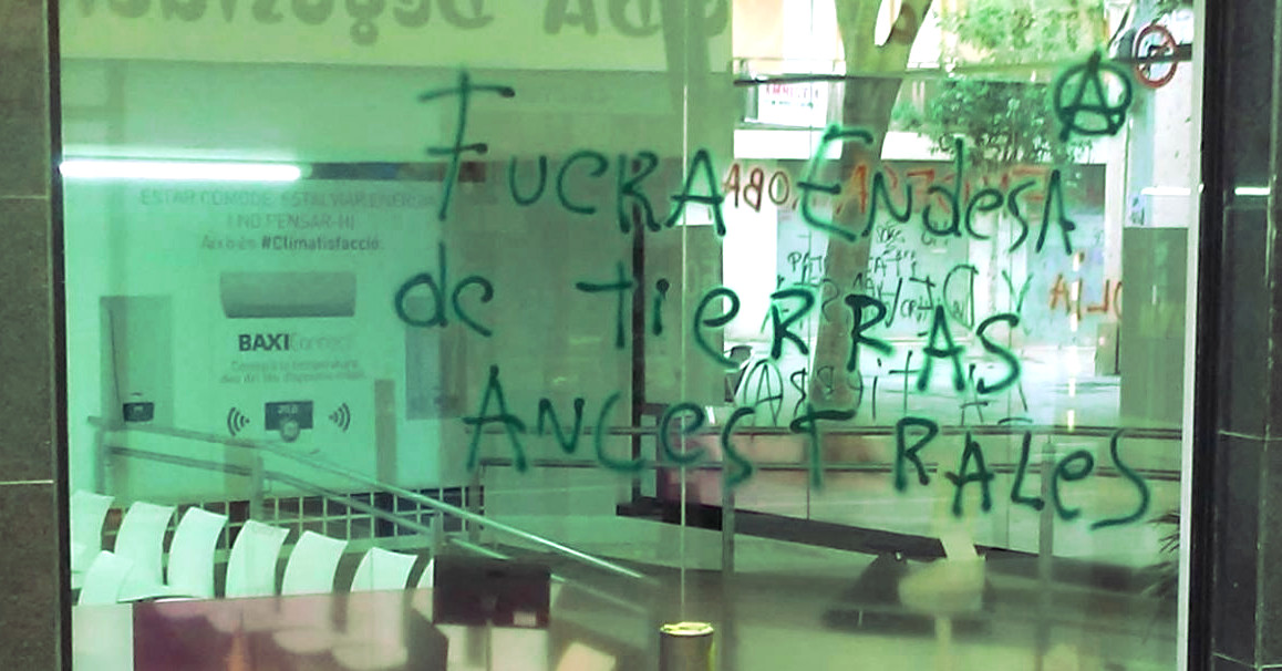 - Grafitis y tiros de pintura en una sede de Endesa en el barrio de Sant Andreu, donde se puede leer «Endesa de tierras ancestrales» y «Endesa roba y arrasa la tierra».