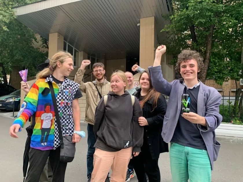 SocFem Alternative activists outside the courthouse after the hearing at which two of their activists were fined 200,000 rubles each for support Afghan women. Courtesy of their Telegram channel and Novaya Gazeta