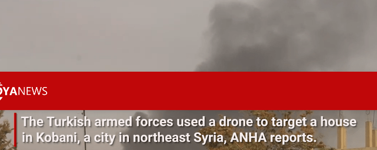 7:57 am 27/12/2021 North East Syria: Death toll from Turkish drone attack rises to five in Kobani The Turkish armed forces deployed a military drone to target a house in Kobani (Kobanê), a city in northeast Syria, on Saturday afternoon.