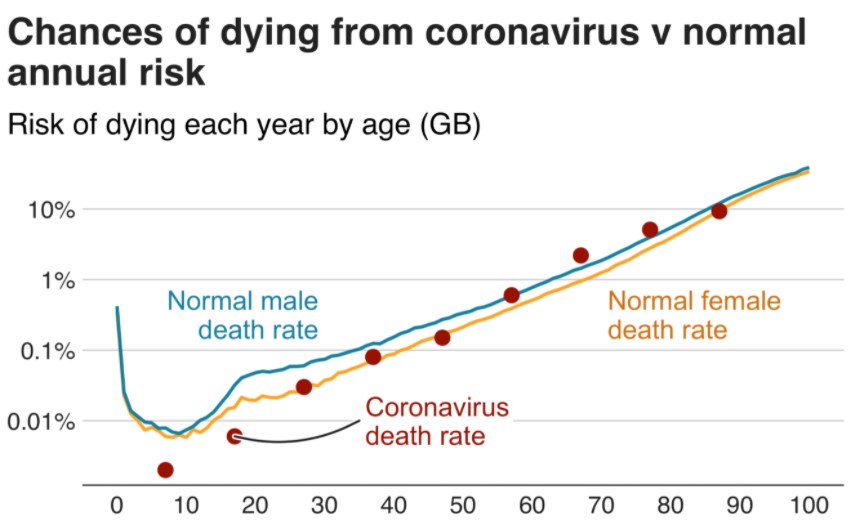 The risk of death “from Covid” follows, almost exactly, your background risk of death in general.