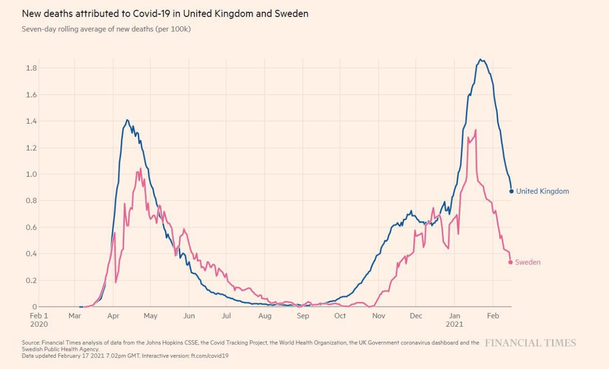 “Covid deaths” in Sweden (no lockdown) vs UK (lockdown)