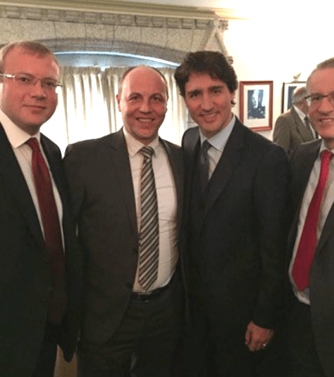 In 2016 Nazi leader Andreiy Parubiy was invited to Ottawa to meet the Prime Minister of Canada. Deputy Chairman of Ukraine’s Parliament, Andriy Parubiy, visited Ottawa in February 2016, meeting with the prime minister. At that meeting (from left) are Ukraine’s Ambassador to Canada Andriy Shevchenko, Verkhovna Rada Deputy Chairman Andriy Parubiy, Prime Minister Justin Trudeau and Member of Parliament Borys Wrzesnewskyj.