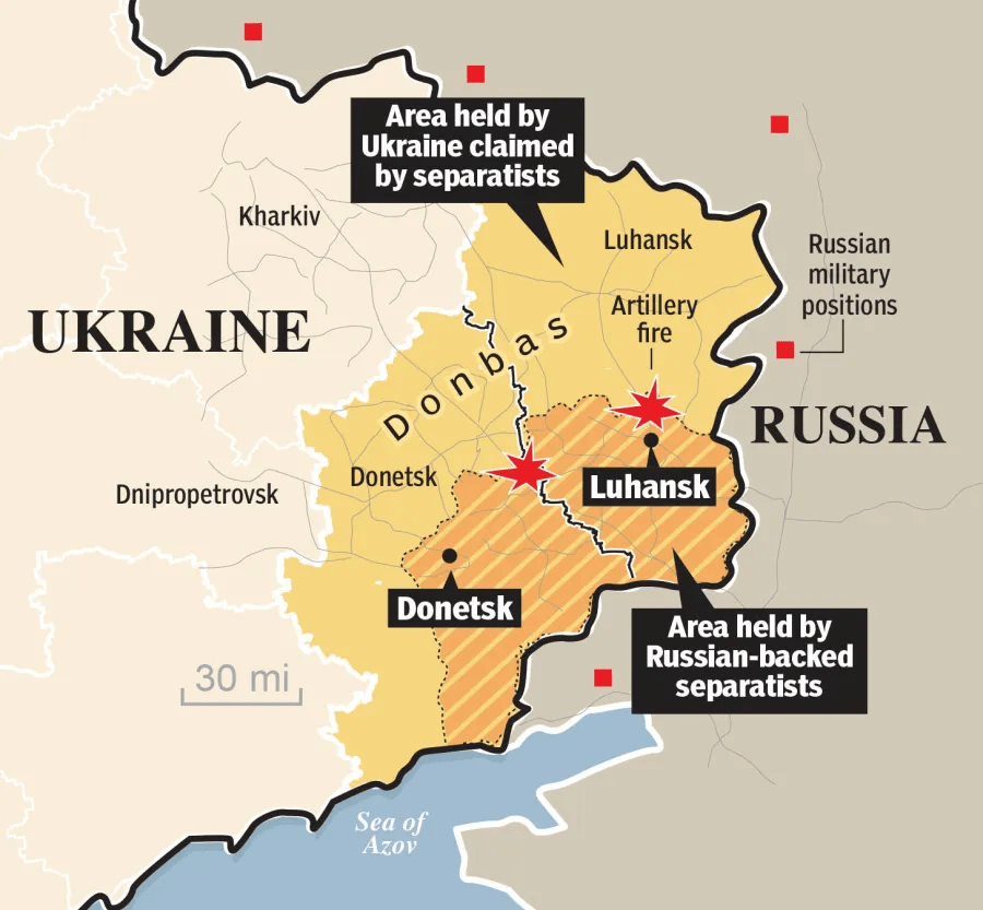 The Ukrainian army declares war and led by Nazi battalions (Azov, Aidar, etc.) begin to surround and bomb the most representative pro-Russian cities.