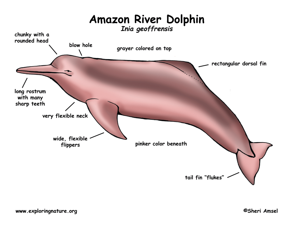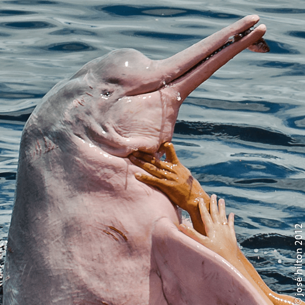 The pink dolphin is also called the Amazon river dolphin, the pink river dolphin, boto cor-de rosa, (pink river dolphin), or botos, which we’ll call them in this article. They weren’t always pink. At birth they’re gray, then they turn pink with age.