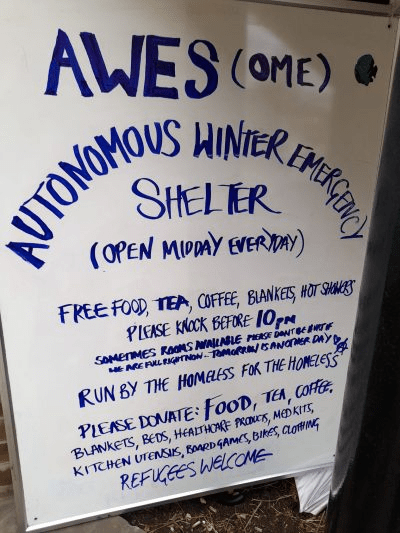 Since being opened by anarchists last year, the shelter has self-organised to provide room and board for dozens of people, including squatters, former renters and rough sleepers, and becoming a hub for the distribution of hundreds of meals, clothes and cold weather gear.