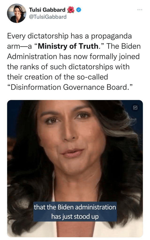 Others disagree with that assessment. As noted by former Congresswoman Tulsi Gabbard (video above), every dictatorship and autocracy has had a ministry of truth, a department of propaganda. And Biden just joined them.