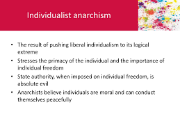 Los individualistas tienen una moral independiente del individuo, sacralizada por la frase «ni dios ni amo», algunos suelen llegar a rechazar los conceptos de leyes, instituciones, asambleas (incluso ciudadanos), por considerarlos autoritarios; la mayoría de los individualistas aborrecen el municipalismo libertario o la consejería marxista, que demuestra esta idea.