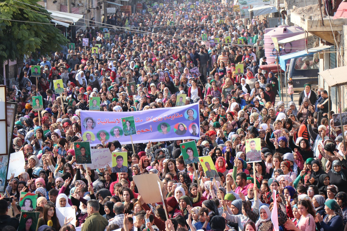 Thousands of people joined a demonstration in Tel Rifaat town of the Shehba Canton on Sunday 10th Nov 2019 in protest at the Turkish state’s invasion and genocidal practices in northern Syria. 40% of the population of Efrin (Afrin) now survive in a semi no-man’s land, defended by the multi-ethnic SDF of AANES, after expulsion by the Turkish invasion, plantation and Turkification of their homes and properties