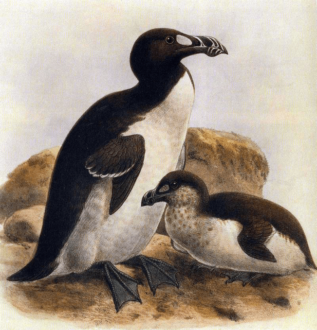 The great auk was almost twice the size of the similar-looking razorbill, which can still be found at coastal breeding sites around the UK. Flightless, the great auk was like the penguin of the Northern Hemisphere, though from a completely different family.