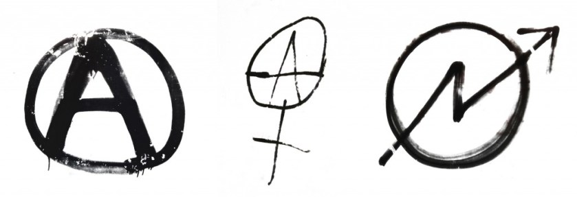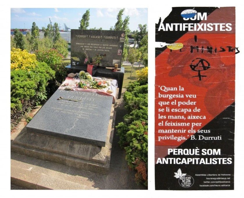 Izquierda: La tumba de Buenaventura Durruti, flanqueada a ambos lados por las de Ferrer y Ascaso. Las inscripciones dicen: “¡Ferrer! ¡Ascaso! ¡Durruti! Simbolizan y recuerdan a los muchos anónimos que dieron su vida por los ideales de libertad y justicia social”. Y abajo, una cita de Durruti: “Llevamos un mundo nuevo en nuestros corazones”. Foto de Lori Dedeyan. A la derecha: Cartel pegado en el barrio de Gracia que dice: “SOMOS ANTIFASCISTAS [añadido: Y FEMINISTAS] PORQUE SOMOS ANTICAPITALISTAS. ‘Cuando la burguesía ve que el poder se le va de las manos, levanta el fascismo para mantener sus privilegios’. – B. Durruti”. Foto de Lori Dedeyan.Grafitis fotografiados en el barrio de Gracia. Símbolos anarquistas, anarcofeministas y okupas, respectivamente. Fotos de Lori Dedeyan.