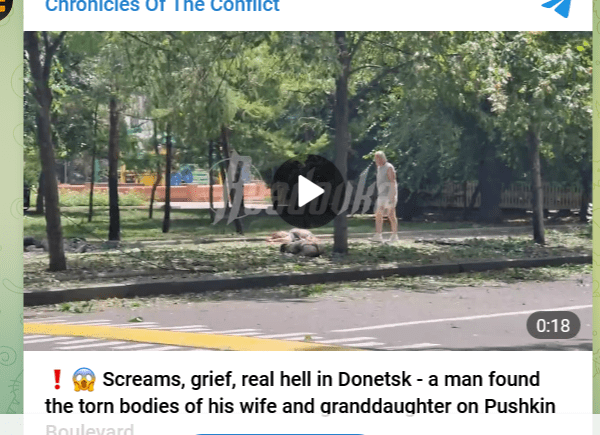 One such hard-to-watch Telegram post (warning: graphic footage) features a man in shock at the gruesome sight of the bodies of his murdered wife and grandchild on a street two blocks from the hotel.