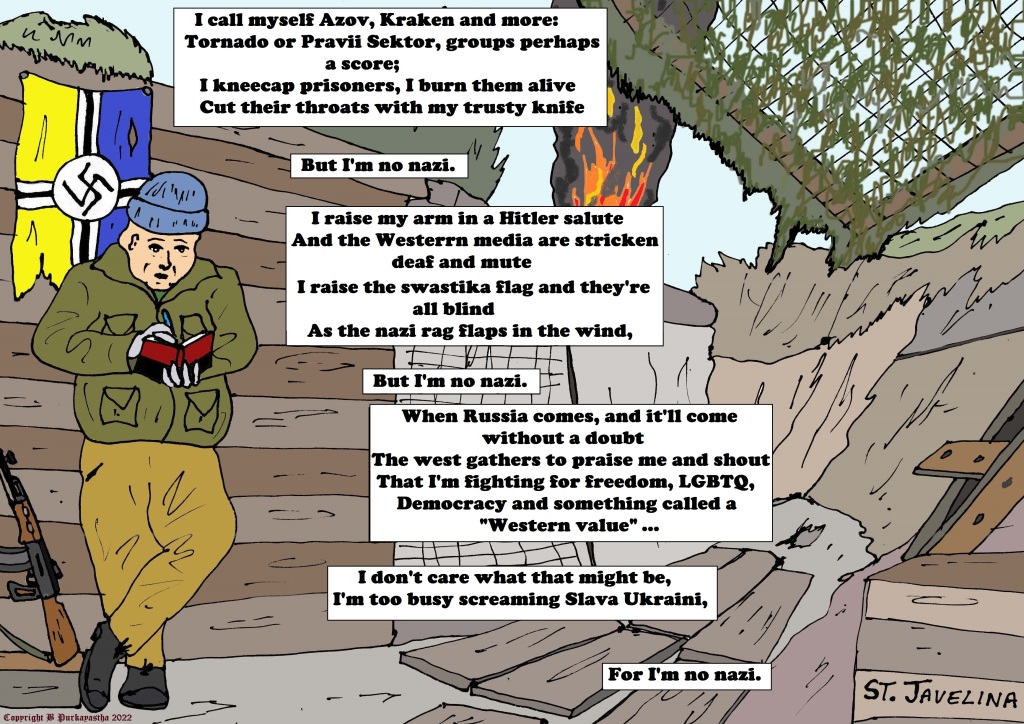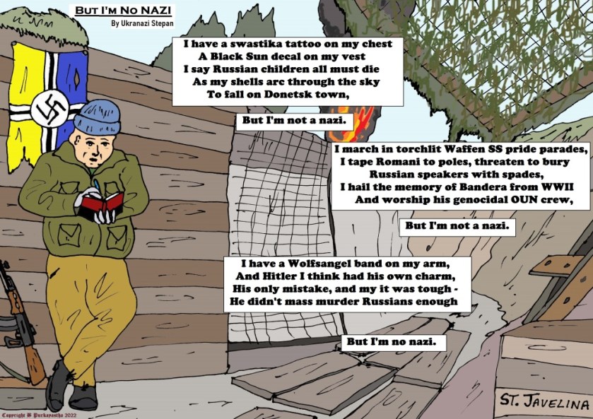 I had – once upon a time – painted illustrations for David Rovics’ song Fallujah. Rovics, unfortunately, has fallen off the deep end and not just become a Ukranazi coup regime supporter but incredibly equates the blueyellow nazis with the Palestinian people, which is especially absurd when you remember that the zionist entity supports the blueyellow Ukranazi coup regime. Rovics wrote and posted a song on that ludicrous premise; this poem – written in ten minutes – is my response to that.