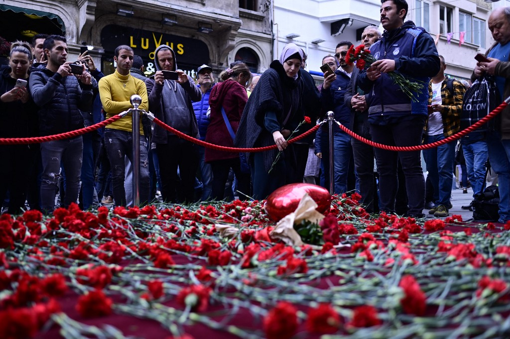 People lay flowers at a makeshift memorial for the victims of November 13 explosion at the busy shopping street of Istiklal in Istanbul on November 14, 2022. – Turkey’s interior minister accused the outlawed Kurdistan Workers’ Party (PKK) on November 14, of responsibility for a bombing in a busy Istanbul street that killed six people and wounded scores, saying more than 20 people have been arrested. (Photo by Yasin AKGUL / AFP)