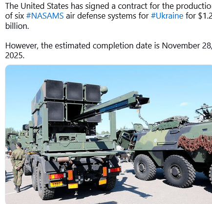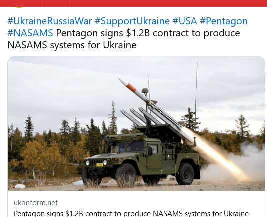 Pentagon to deliver $1.2 billion missile system to Ukraine Raytheon Co., Tewksbury, Massachusetts, was awarded a $1,216,207,829 firm-fixed-price contract for the procurement of National Advanced Surface-to-Air Missile Systems” the Pentagon said a statement.