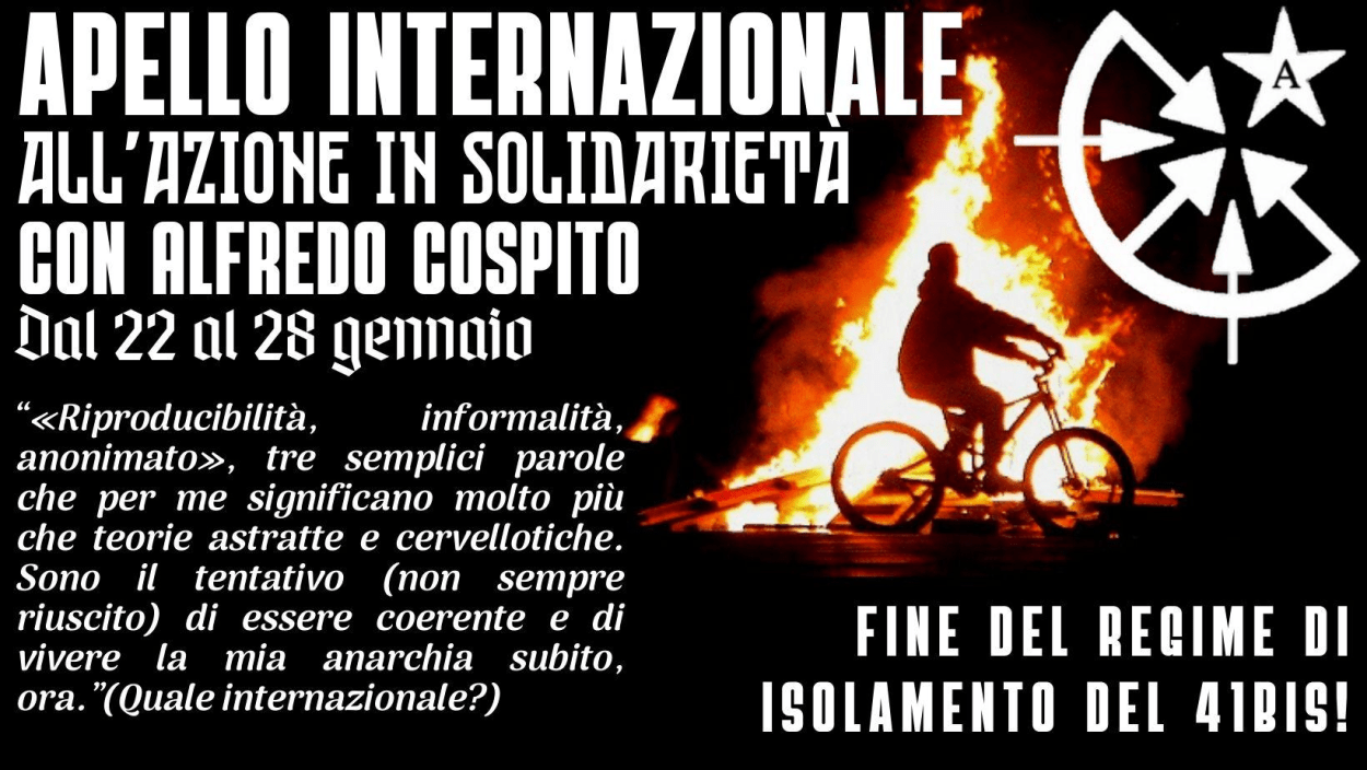 In these days when the comrade’s health condition is rapidly and dramatically worsening, with this initiative the comrades present affirmed the importance of a presence and consequent conflictual practice to be held in the streets, in solidarity with Alfredo in support of the hunger strike. We continue the struggle with rage and determination Alfredo out from 41 bis!