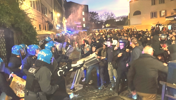 For weeks, there have been sporadic acts of protest and vandalism in support of Cospito. Anarchists have marched in Italian cities, spray-painted city walls, smashed bank machines and windows in Rome, and strung up protest banners equating Cospito’s imprisonment to torture. Banners have shown up dangling from towering construction cranes, outside a prison and down the side of a building at the prestigious Sapienza University of Rome.