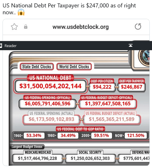 US National Debt Per Taxpayer is $247,000 as of right now.. 😱 pic.twitter.com/CcIs2BsaYD
