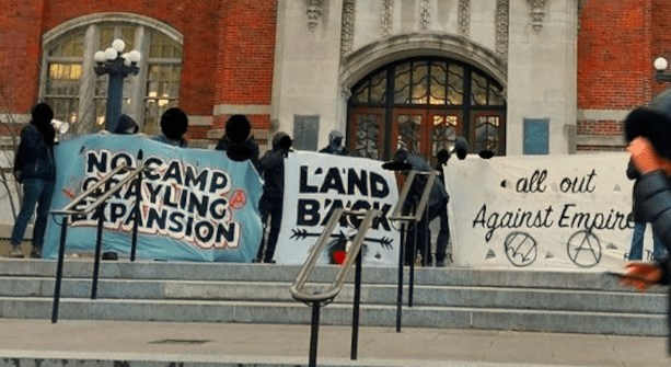 In protest, a series of disruptions against these recruiters took place throughout the day. Multiple people pushed passed the registration desk carrying banners that said “Stop Camp Grayling” and chanting “No prisons, no borders, fuck your law and order,” emphasizing the Army’s plan to expand an already massive and environmentally-damaging National Guard training facility in Grayling, Michigan. The actions converged in a rally outside of the career fair, where protesters chanted “Stop Cop City” and “Fascist, racist all the way, US army, go away!” and passed out flyers to incoming students to warn them against working for the US war machine.