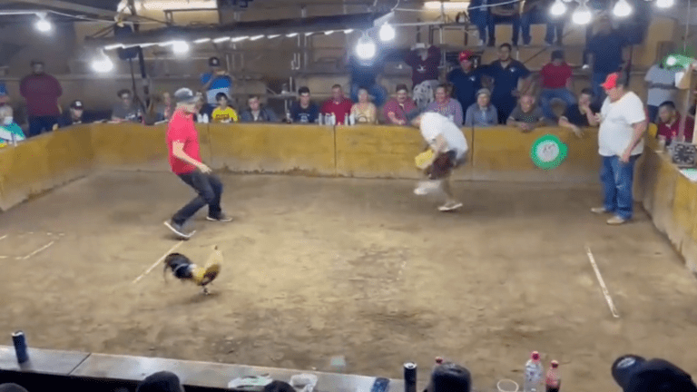One of the birds, however, decided to attack its master instead of the rival rooster, scoring multiple hits to his leg in a matter of seconds. The rooster owner eventually managed to grab his cock, with the opposing bird seizing the opportunity to deliver a few pecks on it.
