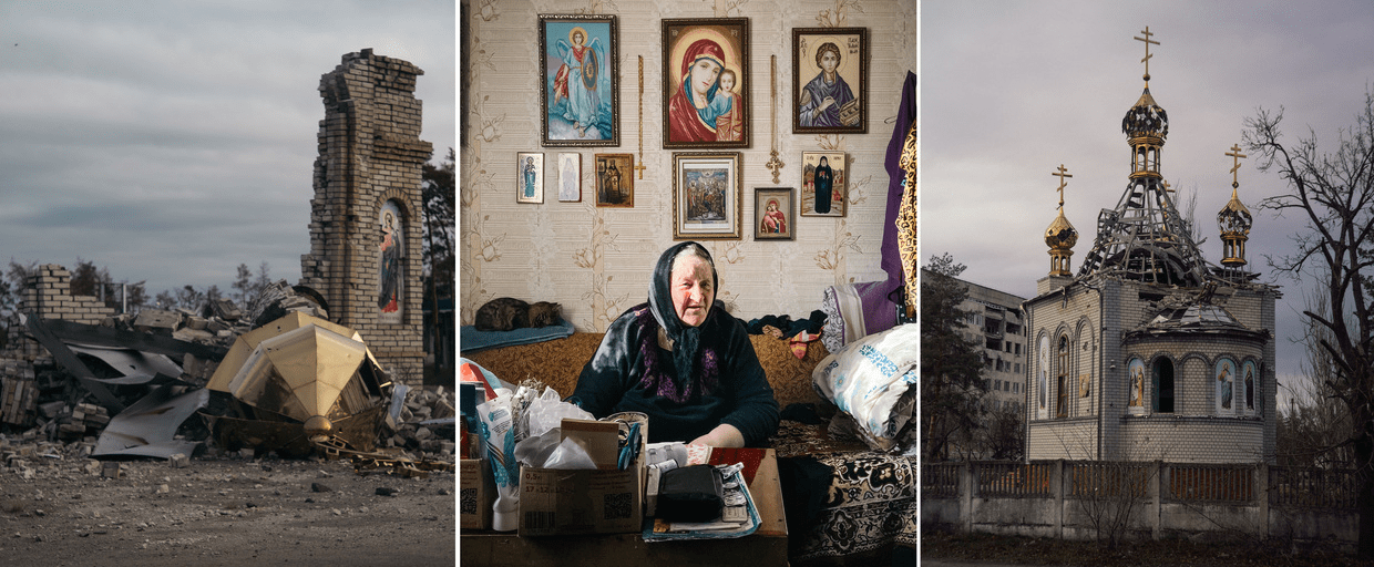 Ruins of a chapel at the entrance to the city; the abbess of a convent in the south of the city; a church damaged by shelling in Severodonetsk. © RT / Arseniy Kotov, special report for RT