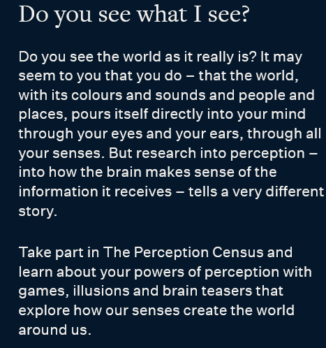 (41:08) So the Perception Census is trying to put that right. It’s basically, in practice, it’s a set of online simple, quite fun (we hope), short, interactive little experiments and illusions and demonstrations that are well suited to map out how we all vary on the inside. All you need is your own computer, and anyone can take part anywhere in the world. We’ve had more than 20,000 people take part so far, from 100 countries or more. We’re trying to make this a real landmark study, so the more people that take part in it, really the better. And everybody does make a difference. And people taking part, they also learn about perception too, both in general and about their own ways of perceiving. So this is a bit of a call to action too, if anybody listening to this is keen to help advance the science and learn more about the area, then please give the Perception Census a go. I’d be very grateful.
