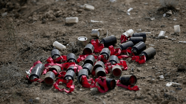 FILE PHOTO: Unexploded bomblets from a cluster weapon © Onur Coban / Anadolu Agency via Getty Images