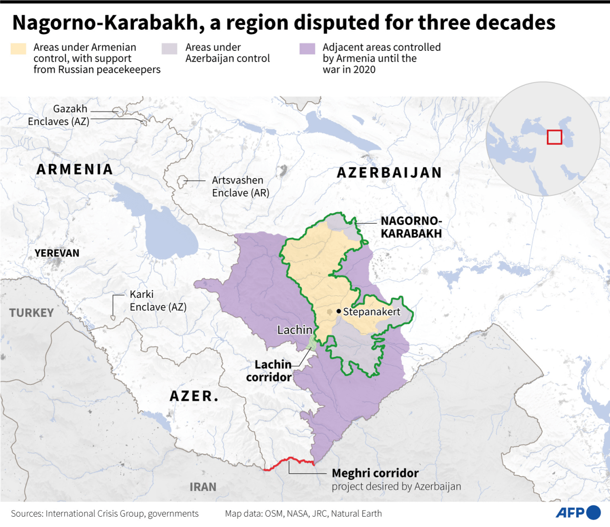 As of 22nd Sept 2023 all of Nagorno-Karabakh / Artsakh is controlled by Azerbaijan, with Russian peacekeepers trying to protect the mainly ethnic Armenian population.