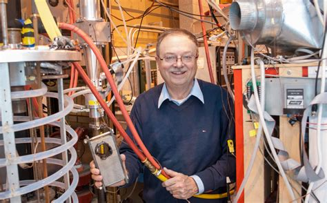 Feel the Heat: Paul Woskov of MIT holds water-cooling lines leading to a test chamber, and a sample of rock with a hole made by a beam from a gyrotron. Photo: Paul Rivenberg/MIT