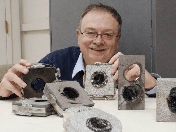 열을 느끼십시오: MIT의 Paul Woskov는 테스트 챔버로 이어지는 수냉식 라인과 자이로트론의 빔으로 만든 구멍이 있는 암석 샘플을 들고 있습니다. 사진: 폴 리벤버그/MIT