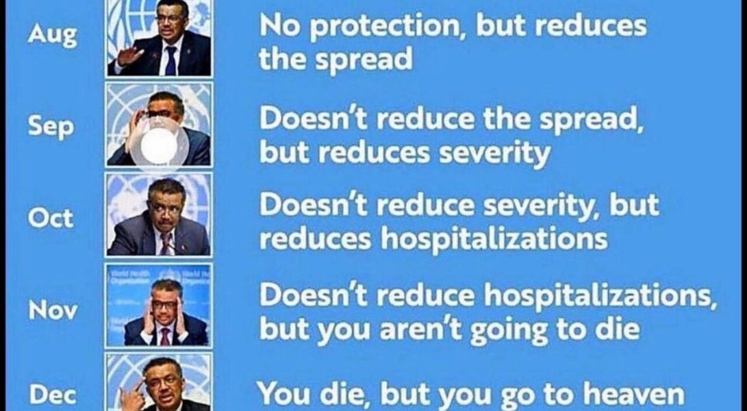 So, although he is still spouting disinformation (i.e. “low risk?”, “severe disease reduction”) he is at least approaching somewhat closer to the common sense decision millions have exercised in response to the global vaccine campaign/experiment. Is this his attempt at a “limited hangout?”