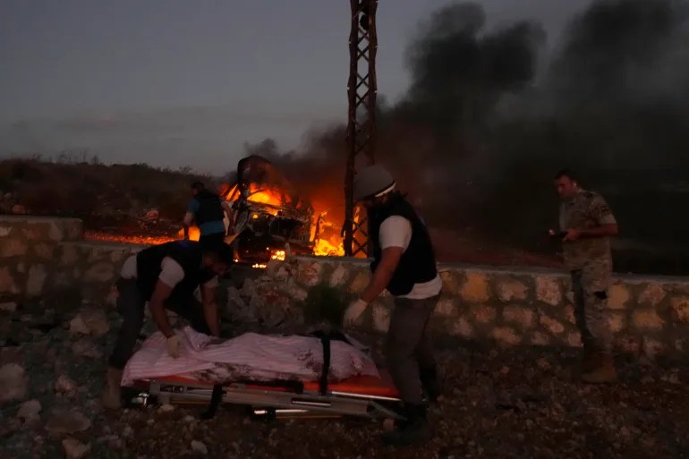 - .Civil Defense workers remove the dead body of a journalist killed by Israeli shelling, at Alma al-Shaab border village with Israel, south Lebanon on Friday