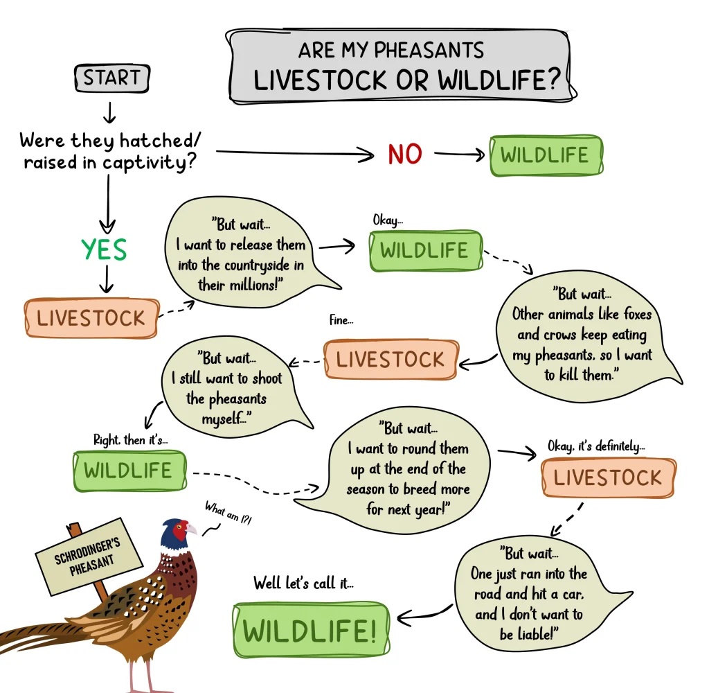 But the law bends and twists to enable these livestock to be blown out of the air. My findings were turned into a brilliant graphic by the campaign group Wild Justice, called Schrödinger’s Pheasant.