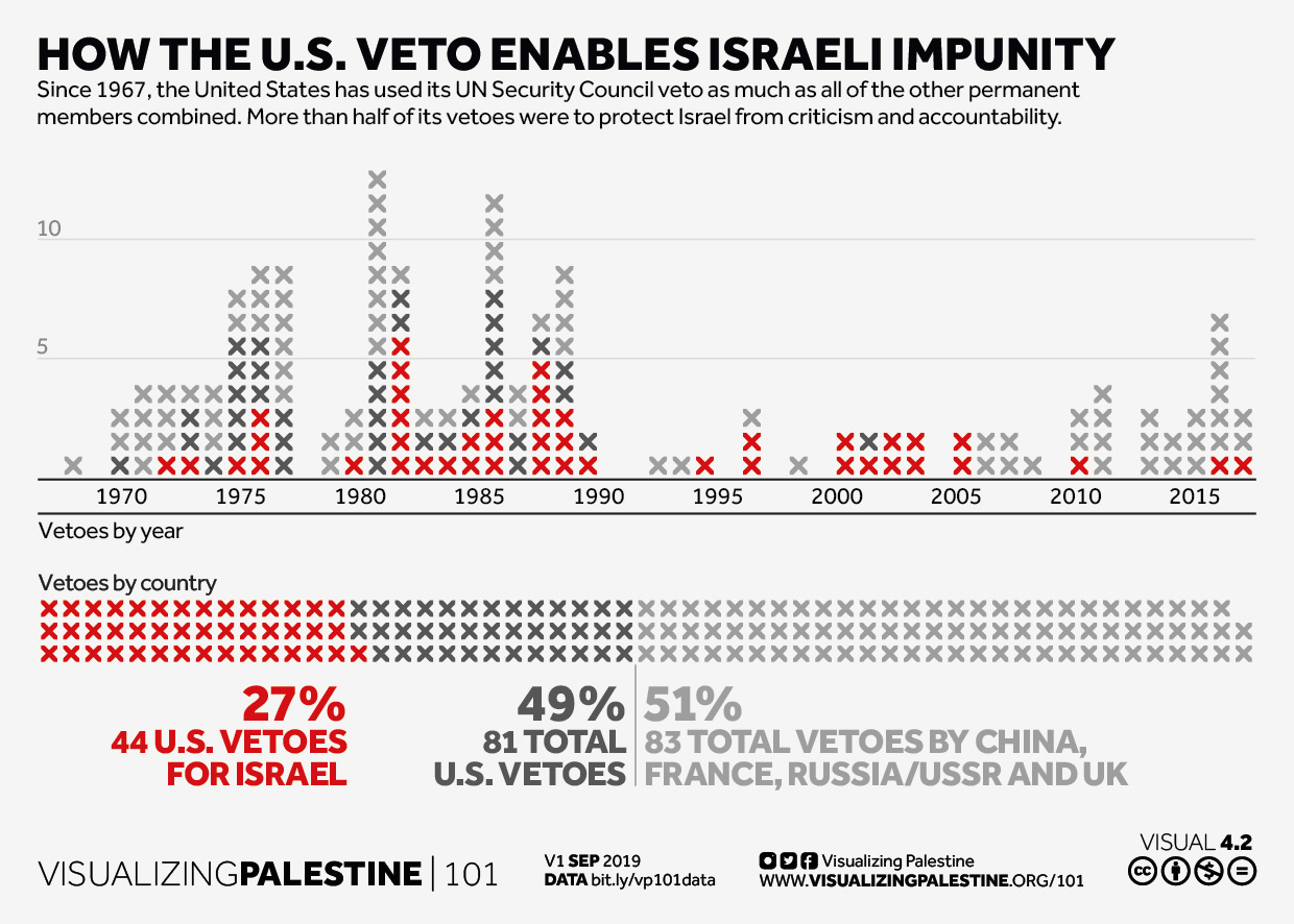 Over the past five decades, the United States has vetoed at least 53 UN Security Council resolutions critical of Israel. – The US’s unequivocal support of Israel has seen it thwart resolutions condemning violence against protesters, illegal Israeli settlements in the occupied West Bank built since 1967 and even calls for an investigation into the 1990 killing of seven Palestinian workers by a former Israeli soldier.