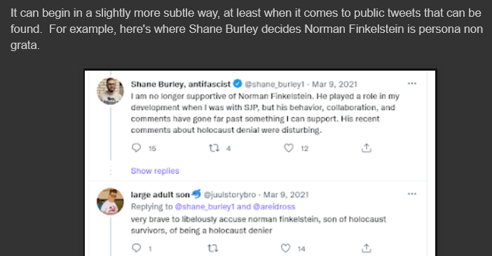 Shane Burley is a cancellation campaigner who masquerades as an antifascism researcher. The main purpose of his “research” seems to be to divide and otherwise undermine left and anarchist groups, networks, and individuals, particularly those who are critical of Israel, and then label us antisemites, while denying the whole time that he is engaging in a cancellation campaign or that he is attacking us for being critical of Israel…